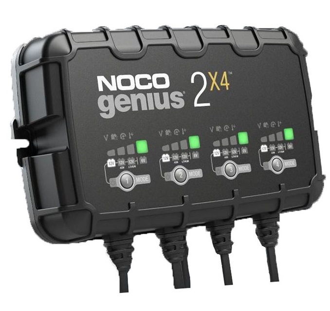 Noco Genius 2x4 6V/12V-2A automatická nabíječka. Nabíječka slouží pro nabíjení všech typů motocyklů o kapacitě do 40Ah a pro režim udržování akumulátorů všech velikostí. Může nabíjet až 4 baterie najednou.